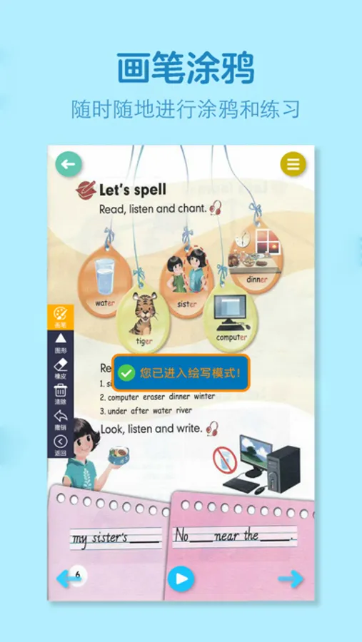 【2】画笔功能,全屏涂鸦让学习更加的有趣让学习更加高效率。完全同步最新发行教材,绝无缺漏页现象。