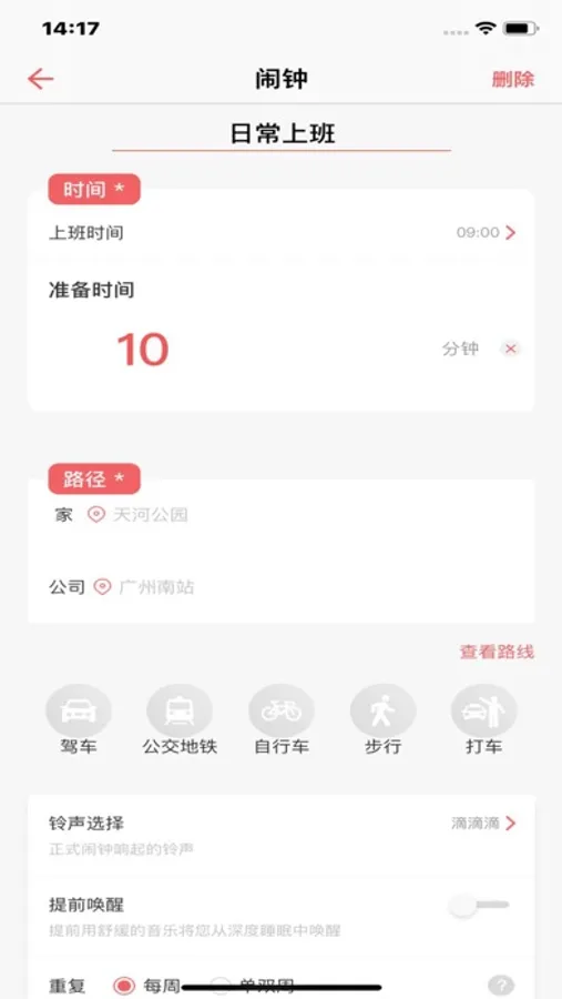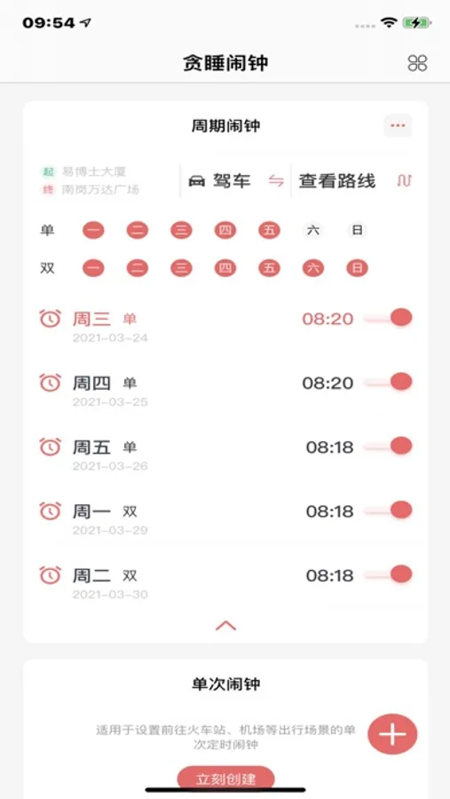 贪睡闹钟能够最大化你的睡眠时间,通过实时获取当天通勤的最新耗时情况,在合适的时间响起,为您的上班出行提供参考