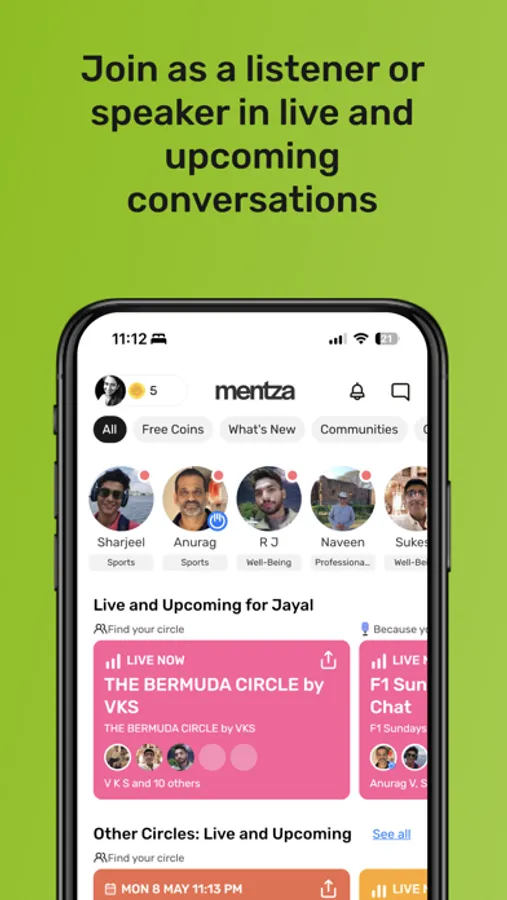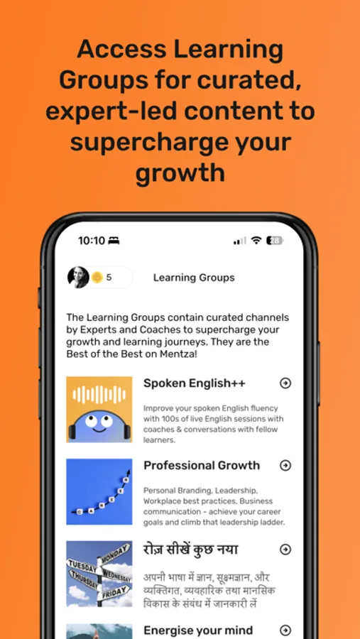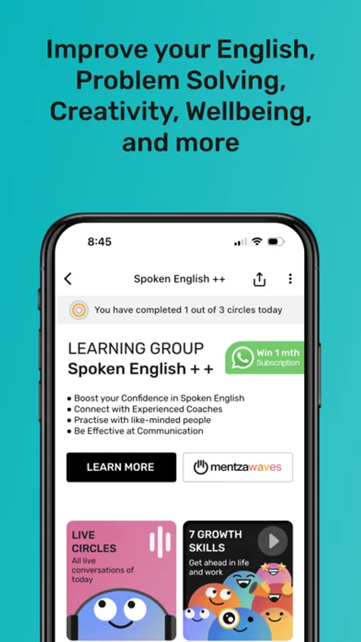 Improve your English, Communication Skills, Problem Solving, Creativity, Wellbeing, and more through engaging discussions and focused 20-minute live audio sessions on various topics. Mentza is here to help you reach your goals and accelerate your growth journey in all aspects of life.