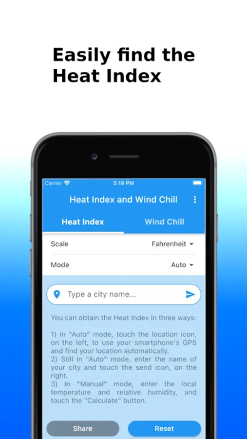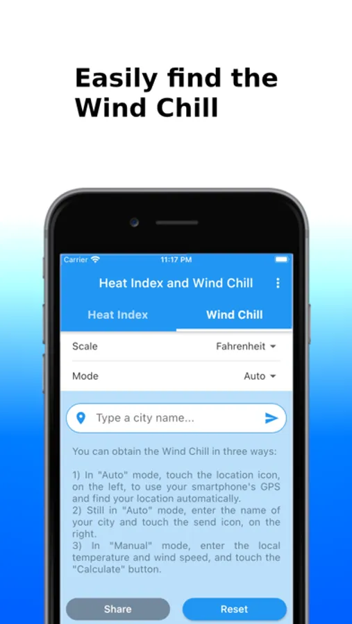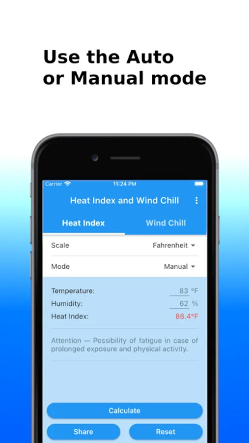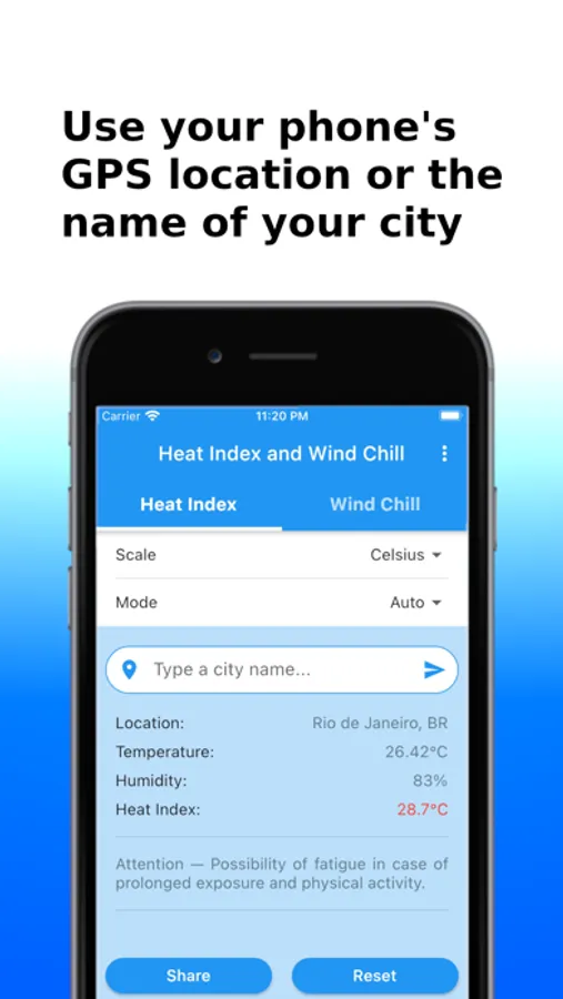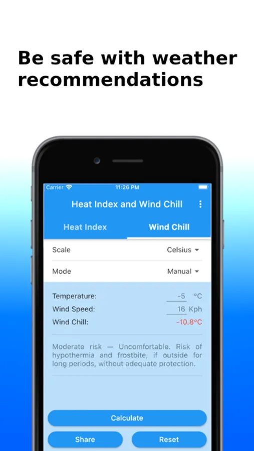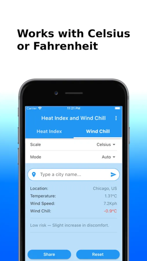 You can obtain the Heat Index and the Wind Chill in Celsius or Fahrenheit, and share the results by SMS, e-mail, WhatsApp, etc.