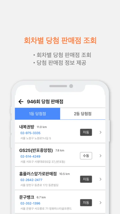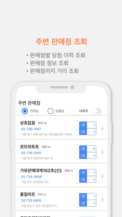 로또 명당 판매점 찾기, 로또 회차별 당첨 판매점 정보, 판매점별 당첨 이력 및 로또 당첨 확인이 가능한 앱입니다.