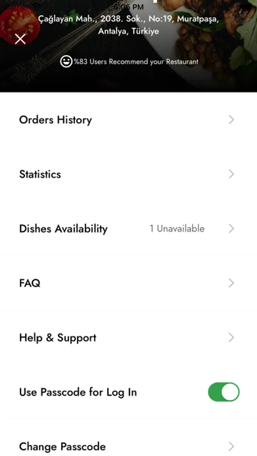 The user of the application is able to see a list of active orders with each topping as a separate item and can select the topping after having it prepared. In addition to that the Yemeksis Restaurant user can take a look at the location of the relevant currier and keep an eye on the timer for the food preparation cycle. The user can also close for sales any item for all integrated sales channels by using a specific menu in cases when the restaurant runs out of ingredients.