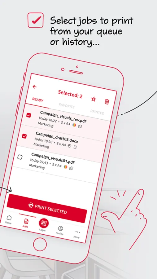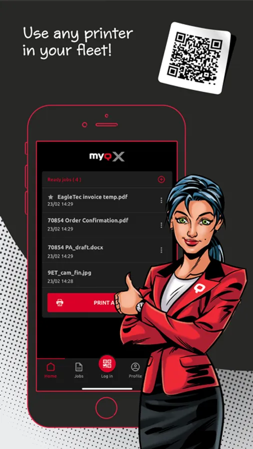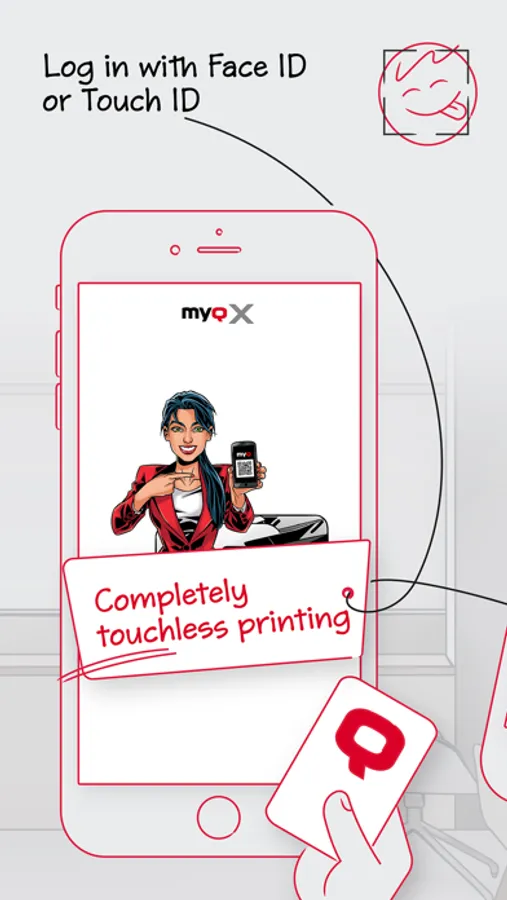 MyQ X Mobile Client is a modern printing app for completely touchless print control of printing devices (MFDs and printers) connected to a MyQ server. Secure login supports biometrics, i.e. fingerprint/face recognition, and the user can upload files for print or select existing jobs waiting in their queue, history or favorites.