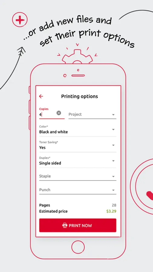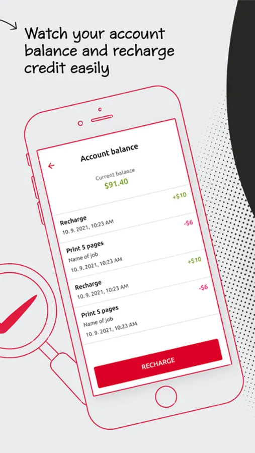 Printing options can be changed immediately before release, like the number of copies, mono/color, duplex/simplex, or assignment under relevant Projects and Accounts. The user has an overview of the status of their quota and credit, which can also be recharged directly from the app.