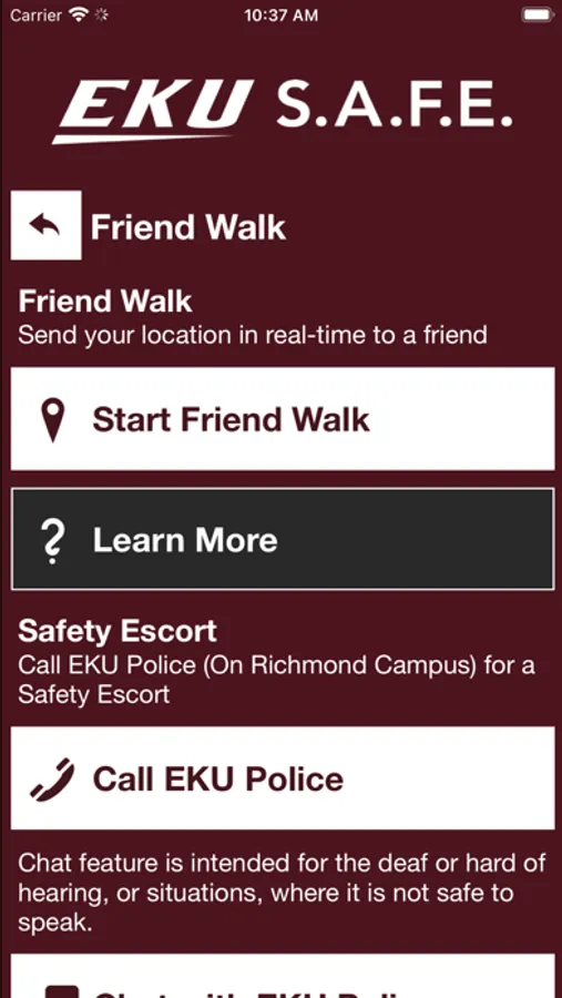 S.A.F.E. is the official safety app of Eastern Kentucky University. It is the only app that integrates with Eastern Kentucky University's safety and security systems. Campus Safety has worked to develop a unique app that provides students, faculty and staff with added safety on the Eastern Kentucky University campus. The app will send you important safety alerts and provide instant access to campus safety resources.