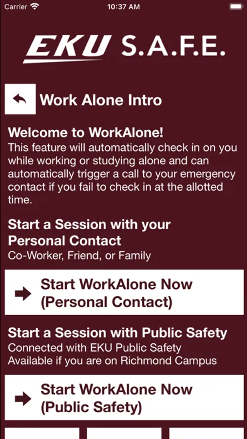 - WorkAlone: Use the app to "check in" with you periodically while working alone or during late hours. If you don't respond, the app will alert Campus Security.