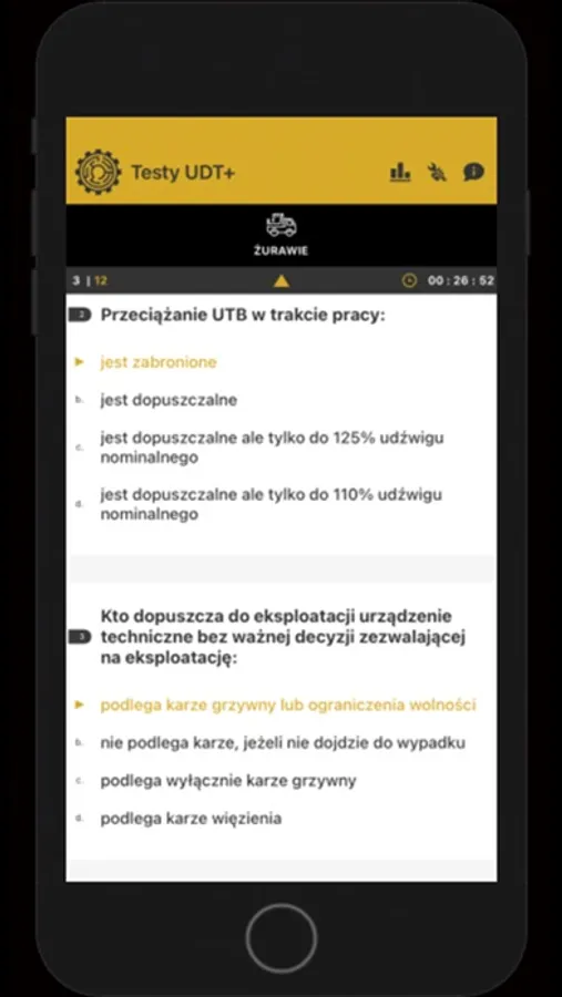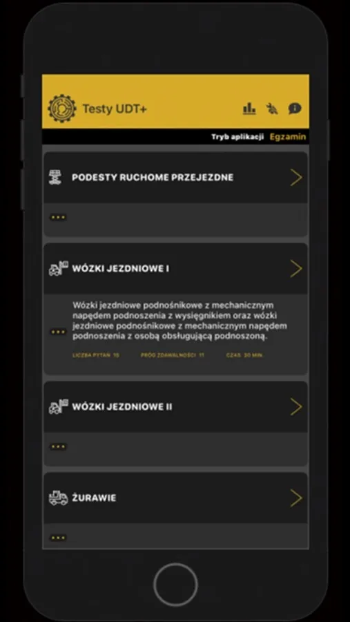 Aplikacja Testy UDT jest przeznaczona głównie dla osób, które zdobywają kwalifikacje Urzędu Dozoru Technicznego na urządzenia transportu bliskiego. Testy teoretyczne udostępnione w aplikacji opracowane są zgodnie z zasadami obowiązującymi na egzaminie teoretycznym Urzędu Dozoru Technicznego.
