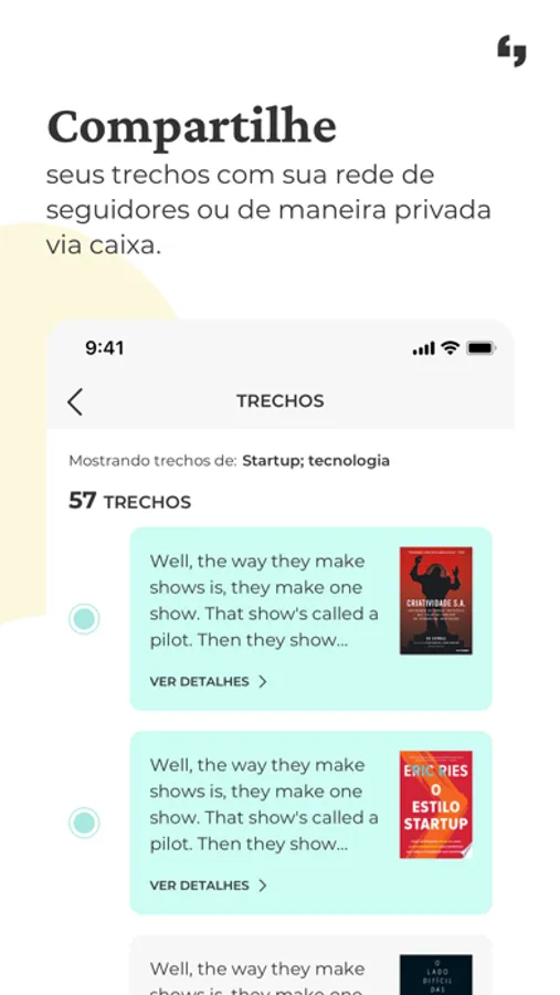 - COMPARTILHAR seus trechos com sua rede, de maneira privada ou até mesmo em outros aplicativos, como o Instagram;