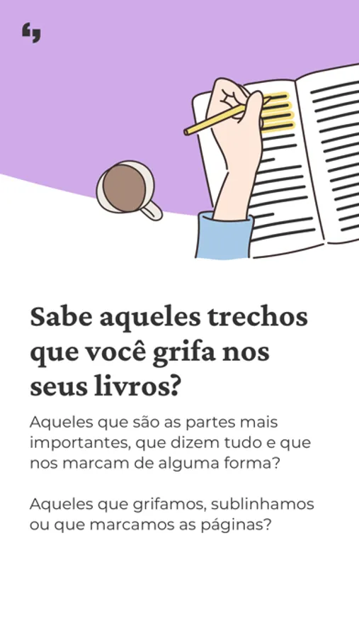 Sabe aqueles trechos que você marca nos seus livros? Aqueles que são as partes mais importantes, que dizem tudo e que nos marcam de alguma forma? Aqueles que marcamos, grifamos, sublinhamos ou que nos fazem marcar as páginas?