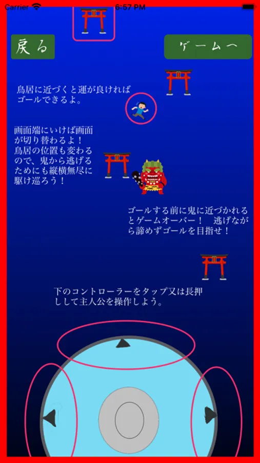 1.「鬼退治開始」ボタンのタップしたら、画面下部のコントローラーの十字キーを押して迫りくる鬼から逃げる。