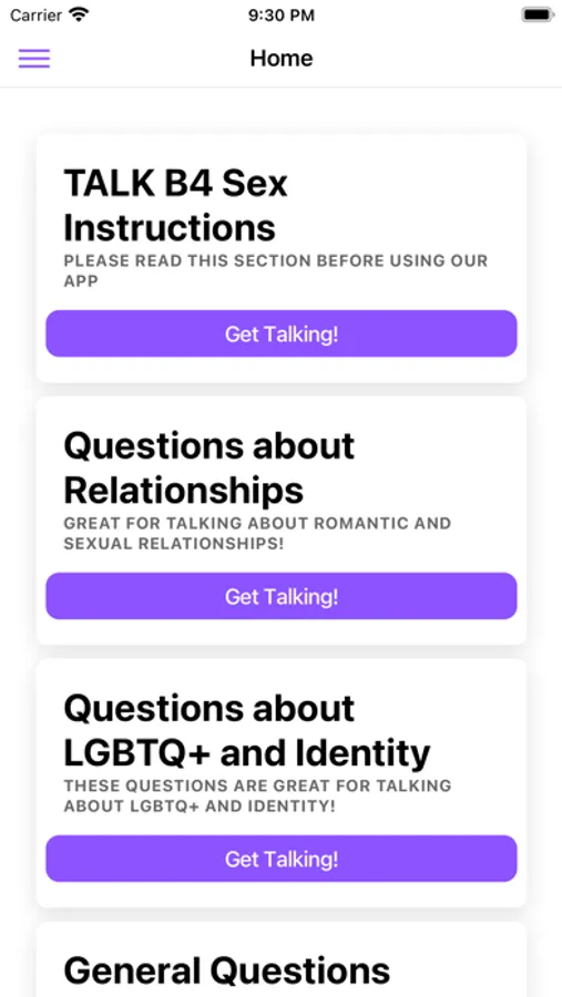 Simply click on one of the six sections of the TALK B4 Sex app, then swipe through the provided questions that encourage honest conversations. To increase your feelings of comfort, state questions aloud one at a time. By doing this, the questions serve as a “cue to action” – this means the actual asking of a question encourages you to talk.
