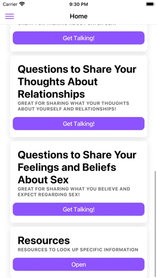 This app was created to help you, people of all ages, talk honestly about sex including healthy relationships and sexual decision making.