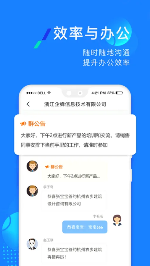 企蜂云具有强大的协同办公功能,提供即时IM通讯、OA协同,主要包括日志、日程、公告、工资条的办公应用,让员工围绕业务高效协同,相互驱动。