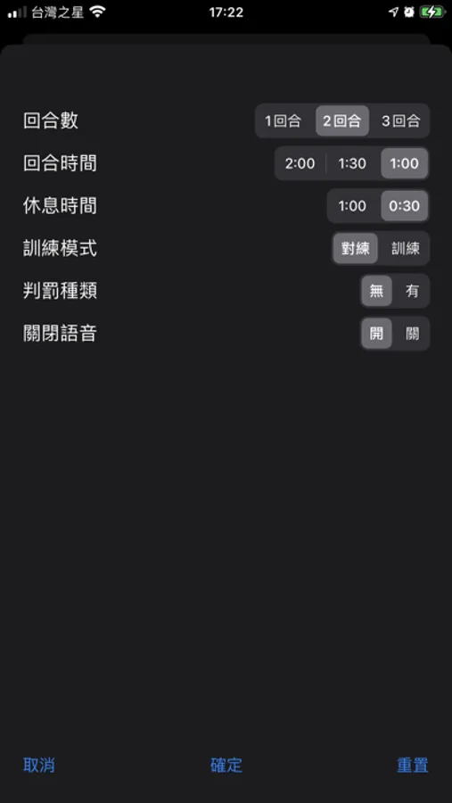 4-2.選擇訓練模式時,只以計時功能為主,取消各種競賽模擬界面,按下開始按鈕,只會按照所設定的時間及回合數進行計時,並在各時間點進行報時,方便選手自行按照所設定之比賽時間進行相關訓練。