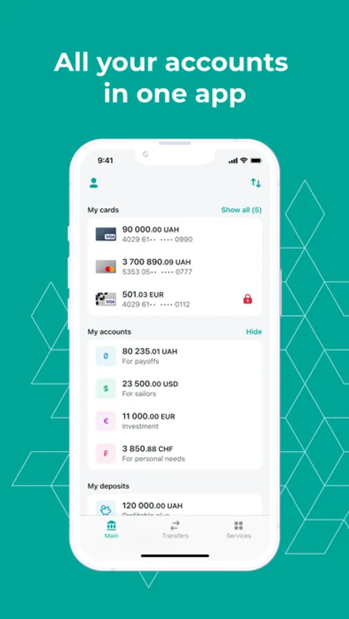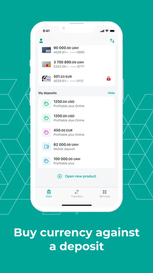 - display of deposit details: amount, validity period, interest payment, prolongation, replenishment possibility;