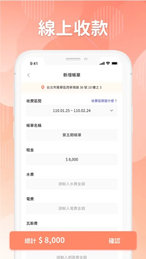 提供房東與房客線上收租的平台,可以客製化租金明細以及收租時間。