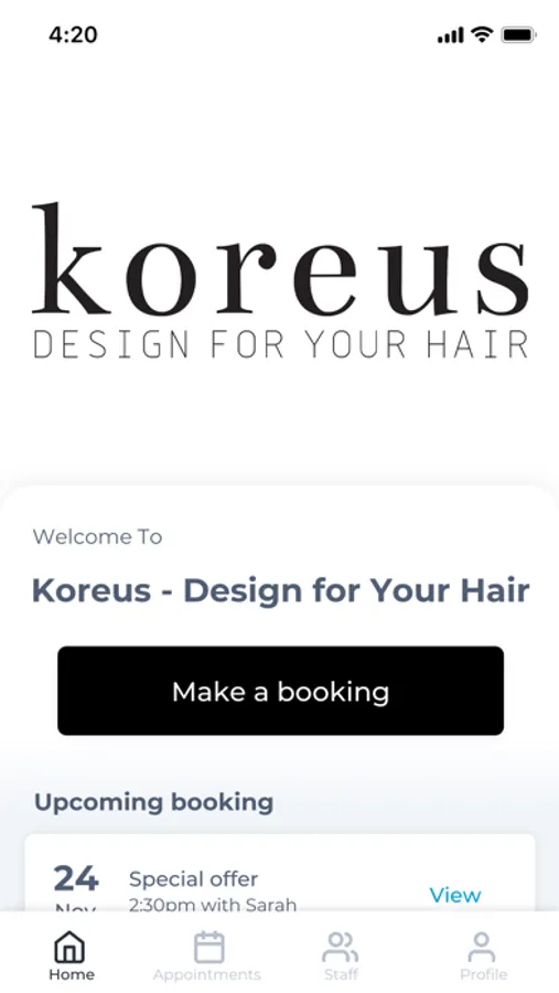 The Koreus - Design for Your Hair app makes booking your appointments and managing your loyalty points even easier. You're just a few taps away from feeling good and looking great!