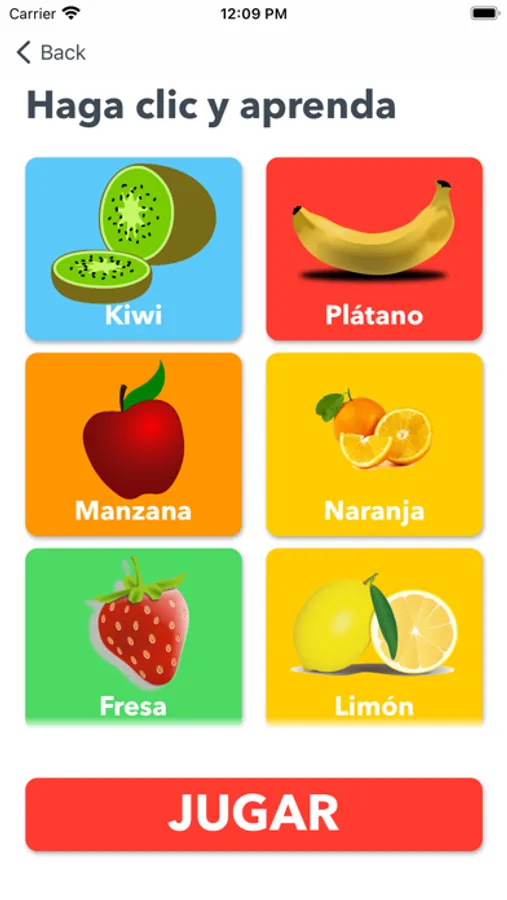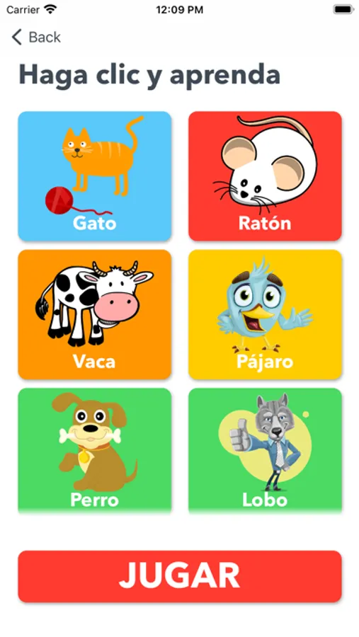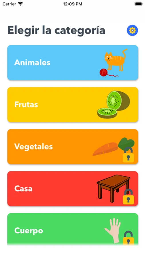 1. Choose category for the words you'r little one wants to learn. Each card with image represents spanish word