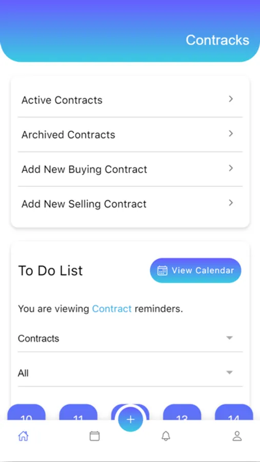 The Dashboard is your quick glance at the list of all of your upcoming items and a high-level overview for contracts that are in progress. This page provides the user with a single location for tracking important upcoming dates and organizes them by due date.