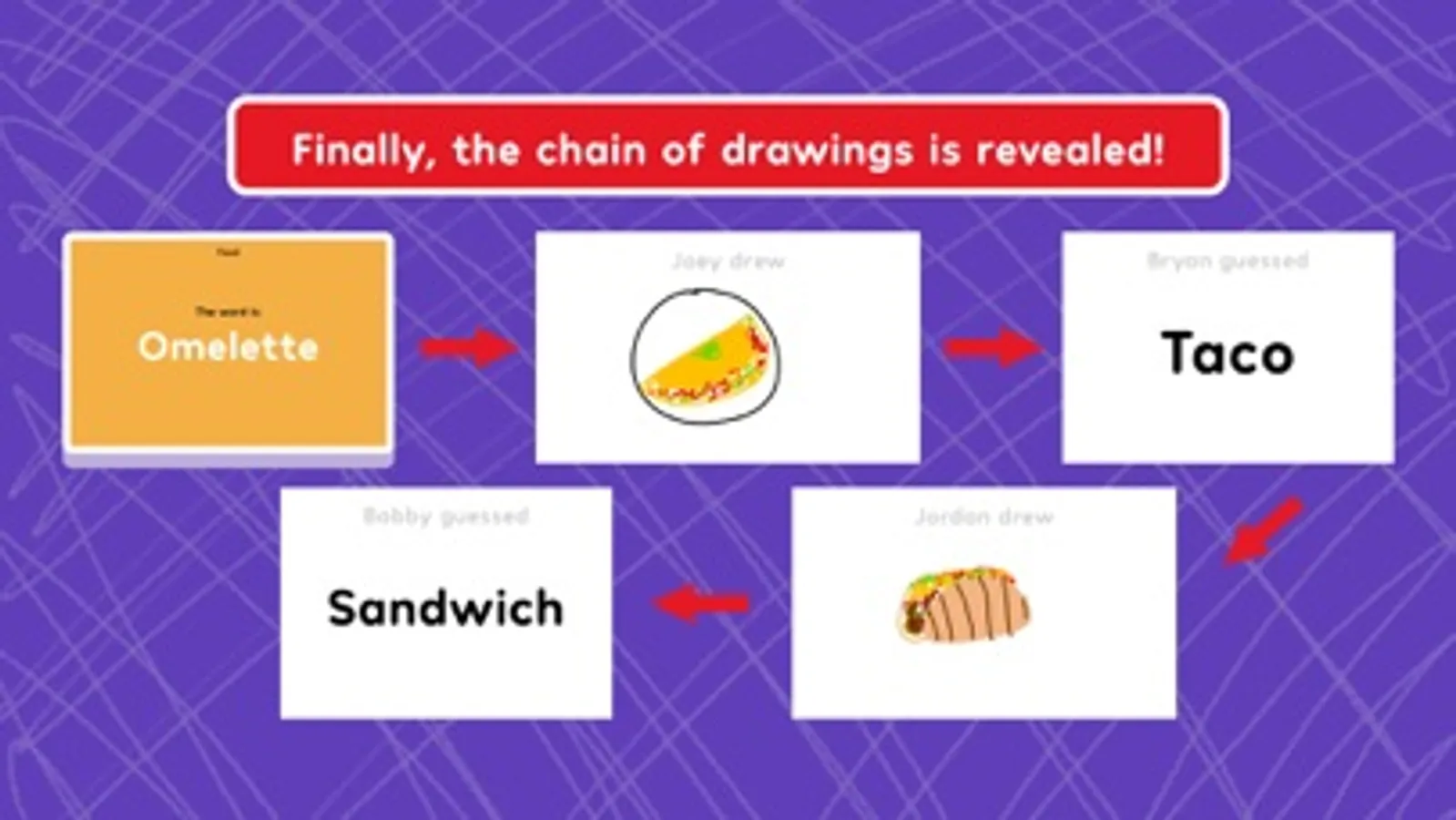 The gameplay is simple: you and your friends take turns drawing and guessing until everyone has had a turn. Then it's time for the BIG REVEAL, where you reveal the hilarious chain of drawings and guesses.