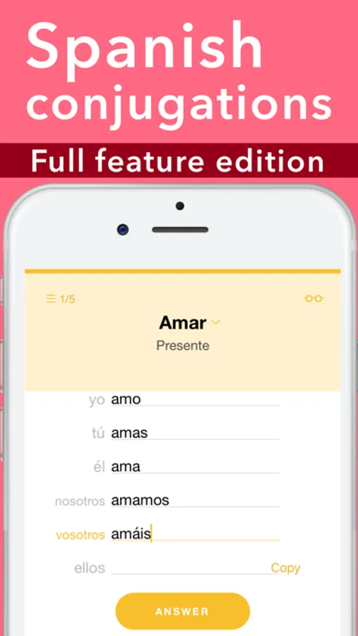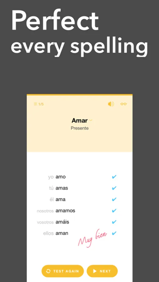 Conjuu breaks the task of learning conjugation into little bite sized tests, allowing you to focus on just the areas you need to improve on. Your answers are checked straight away to improve your certainty and assuredness. When in pressured situations like speaking, you will be able to recall the correct conjugation with confidence.