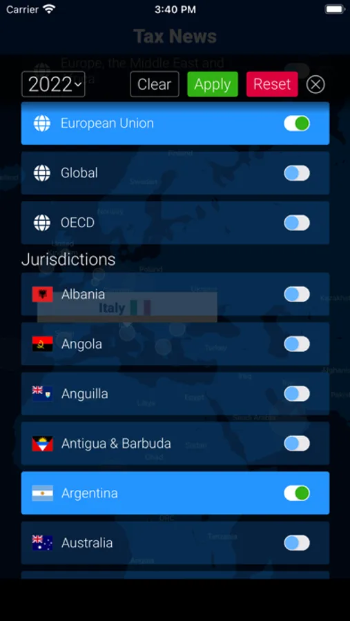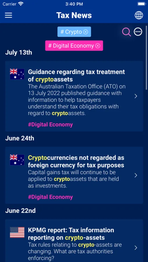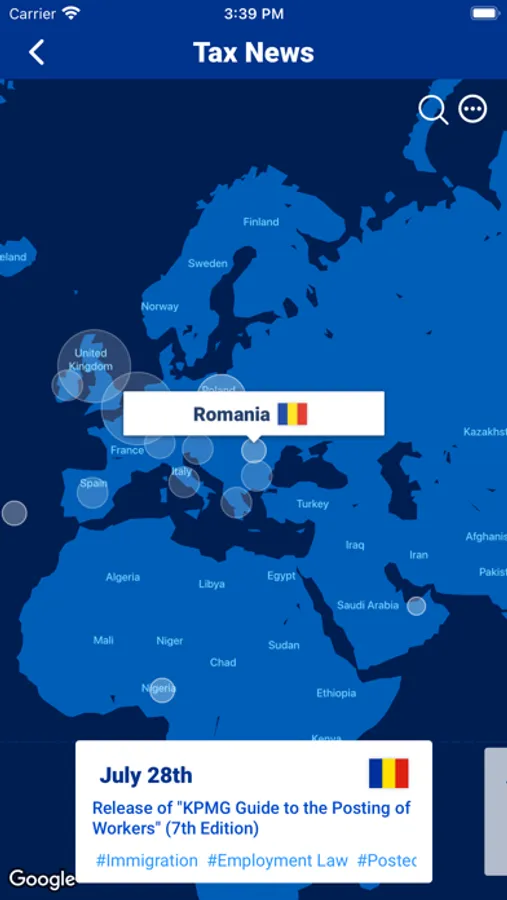 Global tax news is updated regularly and can be viewed in a chronological list or on a world map. The world map features a scrollable carousel from which the article in focus is geographically located as a corresponding marker. In like manner, tapping a marker automatically focuses the carousel to its corresponding article. Articles both in the list and on the world map can be filtered by associated topic, geographic jurisdiction or user-specified search phrase.