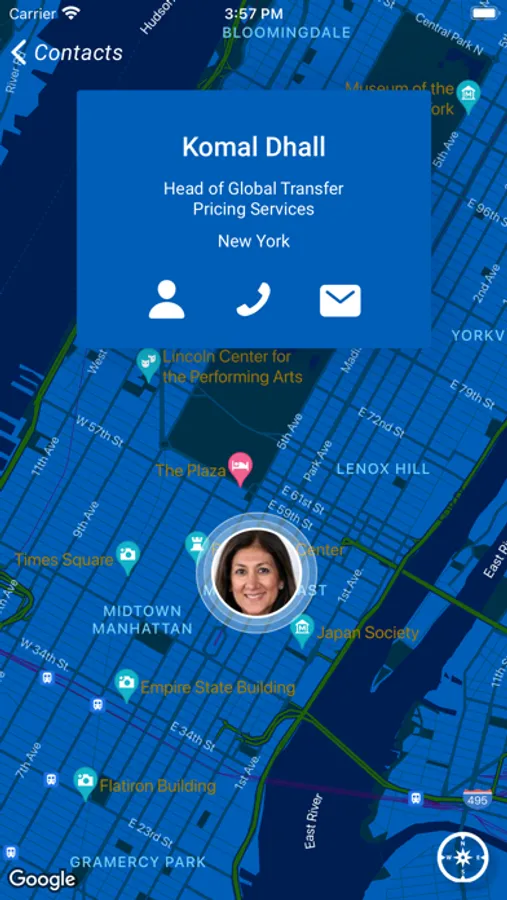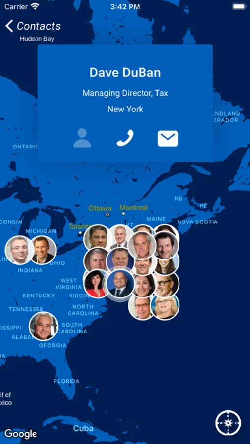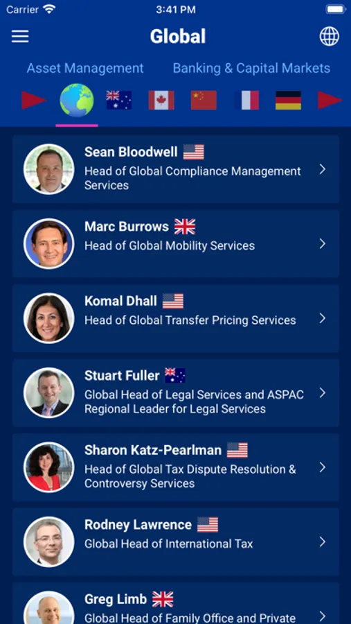 KPMG partner and engagement team contact information can be filtered by geographic jurisdiction or service line and viewed in a list or on a world map where contacts are displayed at their home offices. Contact biography, photo, email address and phone number are accessible from a tactile digital business card. Native dialer and default email launches automatically upon tapping phone or email icons, respectively.