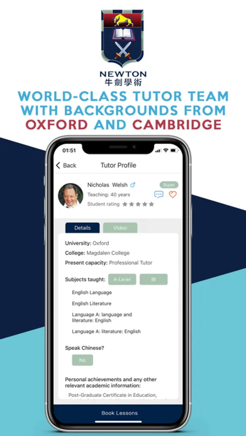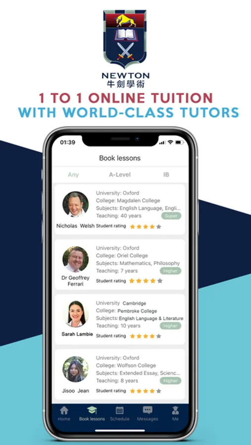 In conjunction with the use of a computer or tablet, our Newton app facilitates one-to-one academic tutorial lessons between students and tutors - tutors who all have academic backgrounds from the Universities of Oxford and Cambridge. Our online tutorial lessons can help you achieve your academic goals and reach new academic heights.