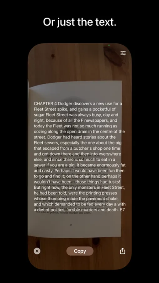 Just the text? Frame a page, a document, a sign, or a receipt. Tap to extract the text. Tap again to copy it to the clipboard.