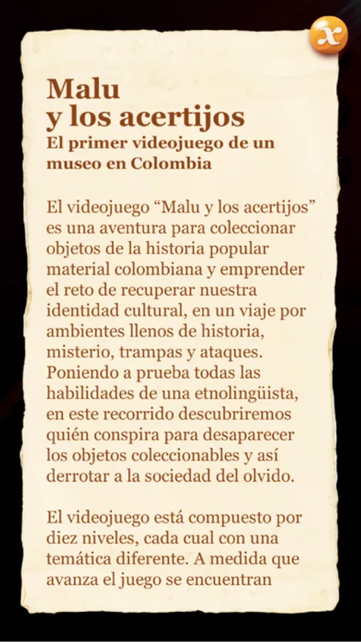 Enfrenta una aventura sin igual coleccionando los objetos perdidos del pasado, entra al mundo de Malu y los acertijos, toma el riesgo para recuperar nuestro patrimonio, recorriendo un viaje sin retorno en ambientes llenos de misterio, trampas, y ataques. Descubre quién conspira para desaparecer los objetos coleccionables, derrota a los enemigos y pon a prueba tus habilidades como etnolingüista en esta intrépida historia.