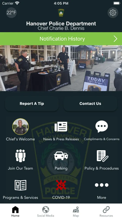 The Hanover Police Department mobile application is an interactive app developed to help improve communication with area residents. The Hanover Police App allows residents to connect with the Hanover Police Department by reporting crimes, submitting tips, and other interactive features, as well as providing the community the latest public safety news and information.