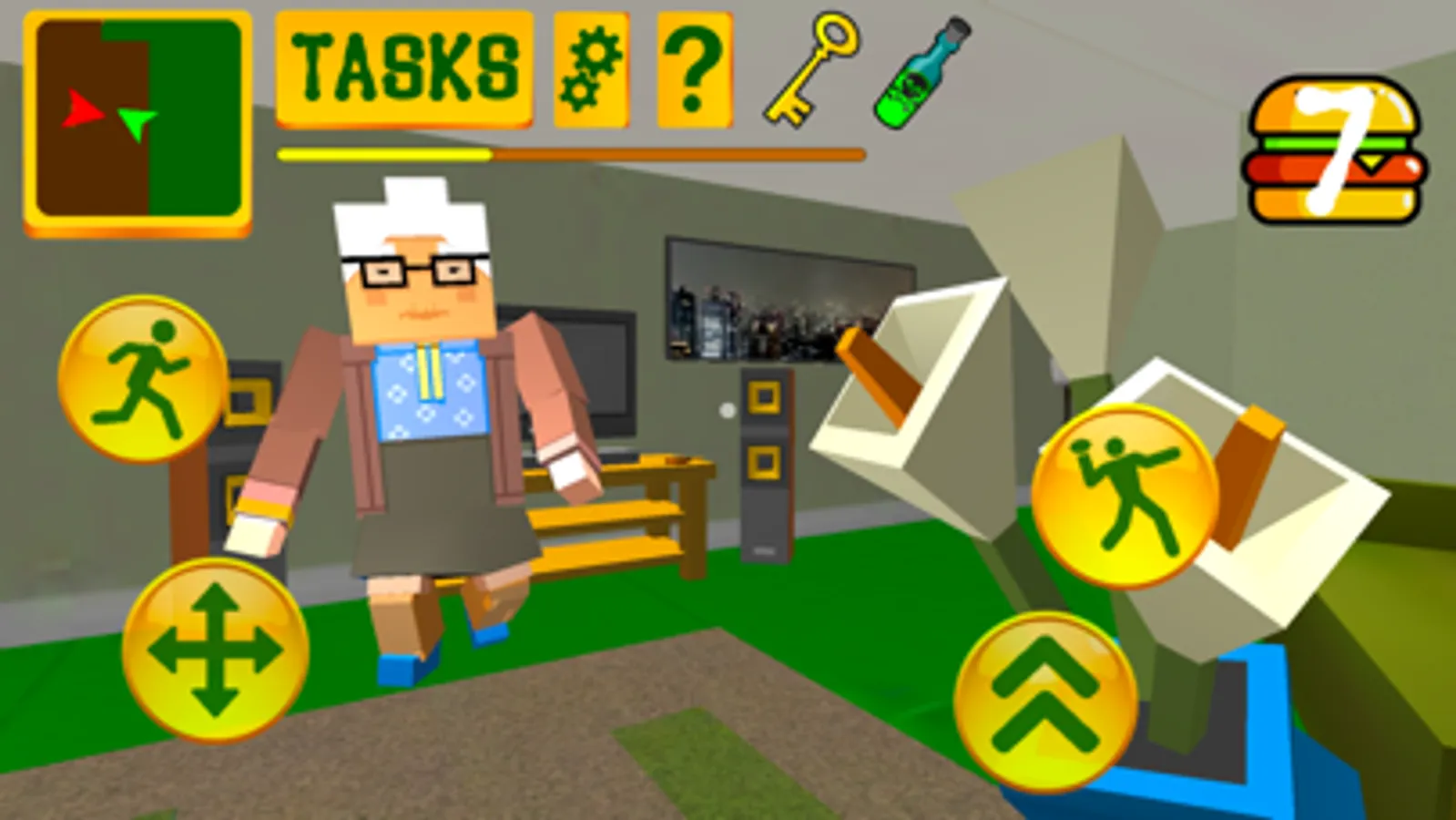 You was often noticed that she behaved strangely. She often greeted you, looked at you and laughed. You decided not to tell your parents about this and single-handedly discovered her terrible secrets. One day you decide to enter this huge block house and find out what secret your evil new neighbor is hiding. As soon as she saw you, she got very angry and ran after you. You managed to escape to your house. You told your parents and grandmother about this, but they did not believe it. She seemed friendly to them, and they did not believe your words. After these events, you decided to investigate what is happening in this scary voxel house and find the key to its scary horrible evil secret!