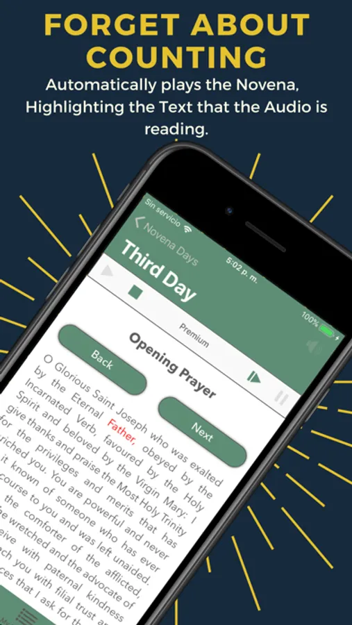 - Automatically plays the Novena, Highlighting the Text that the Audio is reading.