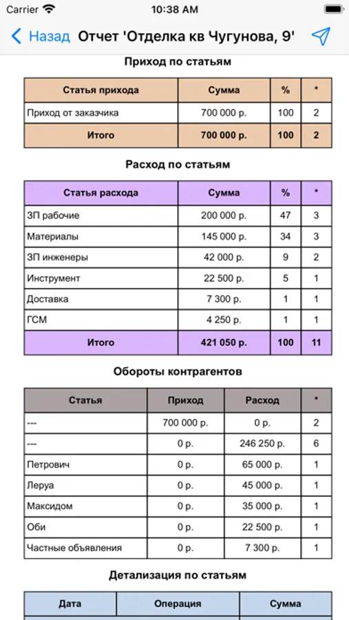 СтроБух — это бухгалтерская программа на смартфон для прорабов, самостоятельно ведущих свои объекты. Сметы, взаиморасчеты с заказчиком, приобретение материалов и инструментов, аренда спец техники, транспортные расходы, услуги сторонних лиц, выдача зарплаты рабочим — все операции заносятся в СтроБух на лету в смартфон. Компьютер с Excel и 1с больше не нужен. Не надо вечером после работы сводить чеки в отчеты. В любой момент времени вы знаете финансовое состояние своих объектов. Видите — зарабатываете деньги на них или уже теряете. Бюджетируете расходы. Фиксируете опыт.