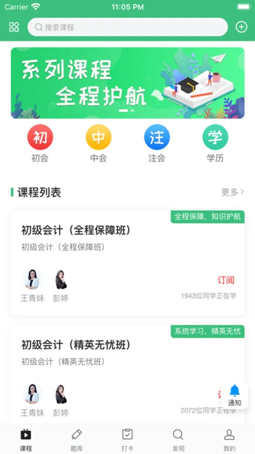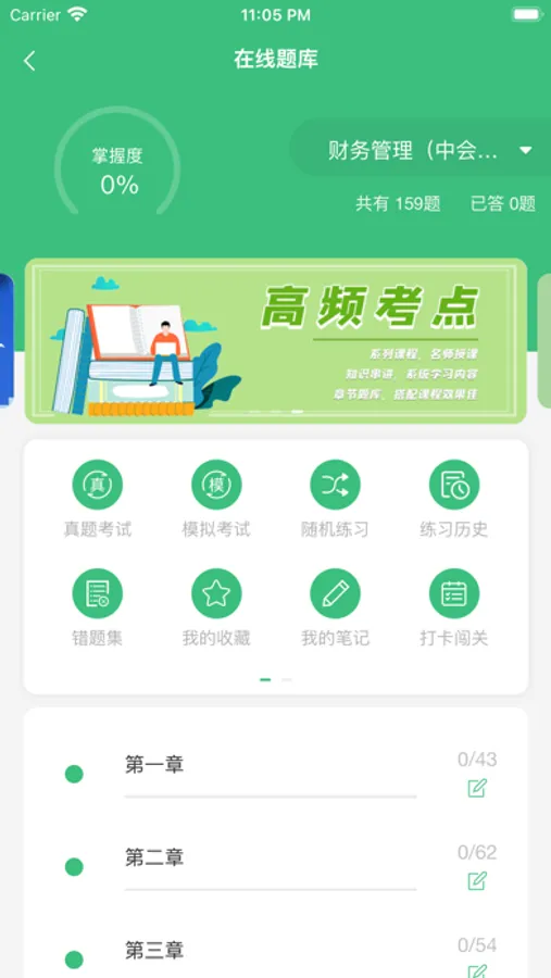 刷题:参与模拟练习及测试,跟随课程章节分配章节题库,一课一题库模式,掌握课程系统知识点;
