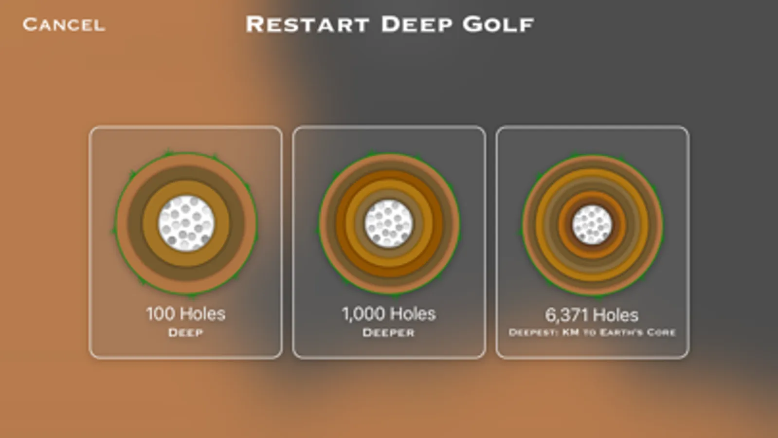 Golf down through the Earth. Billions of procedurally generated holes, every game and device is different. Play to the center of the Earth and see what you find along the way. Replay with all new holes.