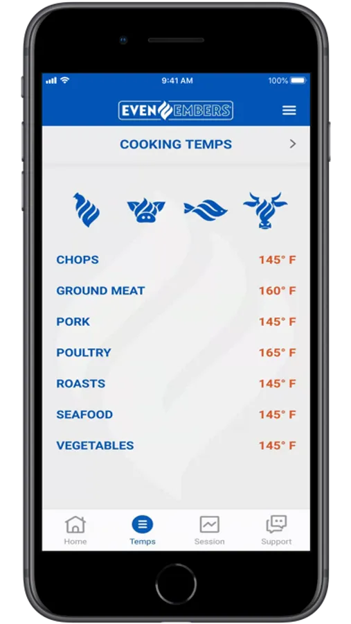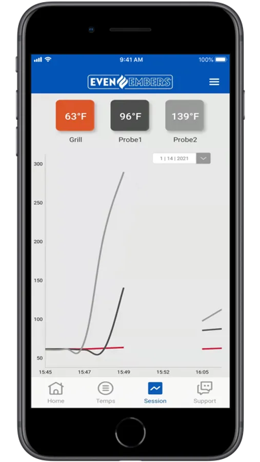 The Even Embers Grilling App enables you to grill with precision every time you fire up the grill. Utilize the Bluetooth connectivity to set your desired temperature on the grill or plug in your meat probes to monitor the progress of your favorite cuts of meat.