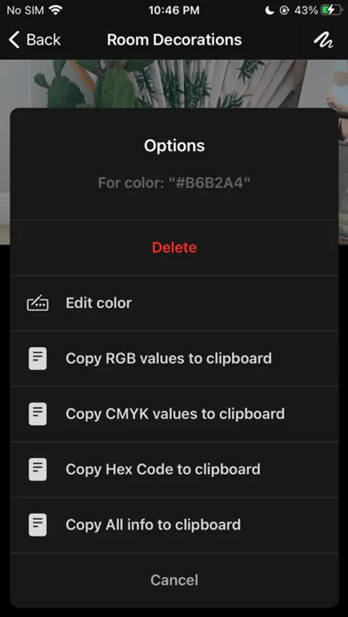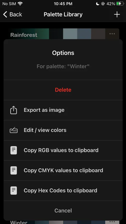• Copy a palette's RGB, CMYK, and Hex Code for ALL colors inside it to the clipboard.