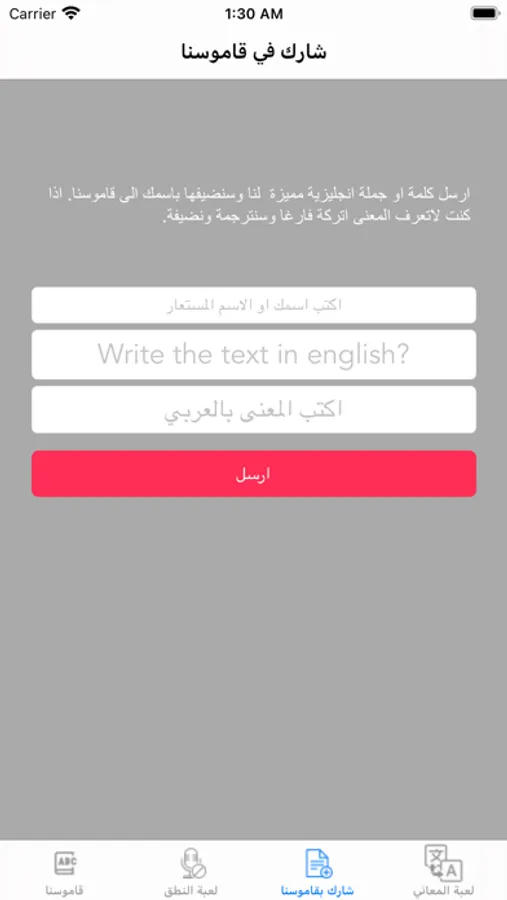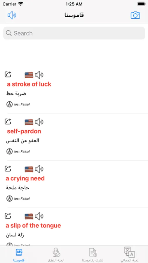 في هذا التطبيق، نجمع لكم قائمة بالكلمات والجمل والمصطلحات الانجليزيه المتداوله بالحياه اليومية. تستطيعون المشاركه بواسطة ارسال جمله او مصطلح الينا لنضيفها باسمكم في القاموس. اذا كنت لا تعرف المعنى فقط ارسل لنا النص وسنقوم بترجمته واضافته. تستطيع اضافه العبارات الموجوده على الصور مباشره بالظغط على زر الكامرا وتحديد النص وسيقوم النطبيق بقرائه الصور وتحويلها الى نص ومن ثم حفظة في القاموس. لاختيار نص مناسب يجب ان يكون مميز ومستخدم في الحياة اليوميه. اضفنا اختبار لتطوير نطقك للنصوص واختبارا للمعاني لتذكيرك بجمل ومصطلحات القاموس.في هذا التطبيق، نجمع لكم قائمة بالكلمات والجمل والمصطلحات الانجليزيه المتداوله بالحياه اليومية. تستطيعون المشاركه بواسطة ارسال جمله او مصطلح الينا لنظيفها باسمكم في القاموس. اذا كنت لا تعرف المعنى فقط ارسل لنا النص وسنقوم بترجمته واضافته. تستطيع اضافه العبارات الموجوده على الصور مباشره بالظغط على زر الكامرا وتحديد النص وسيقوم النطبيق بقرائه الصور وتحويلها الى نص ومن ثم حفظة في القاموس. لاختيار نص مناسب يجب ان يكون مميز ومستخدم في الحياة اليوميه. اضفنا اختبار لتطوير نطقك للنصوص واختبارا للمعاني لتذكيرك بجمل ومصطلحات القاموس.