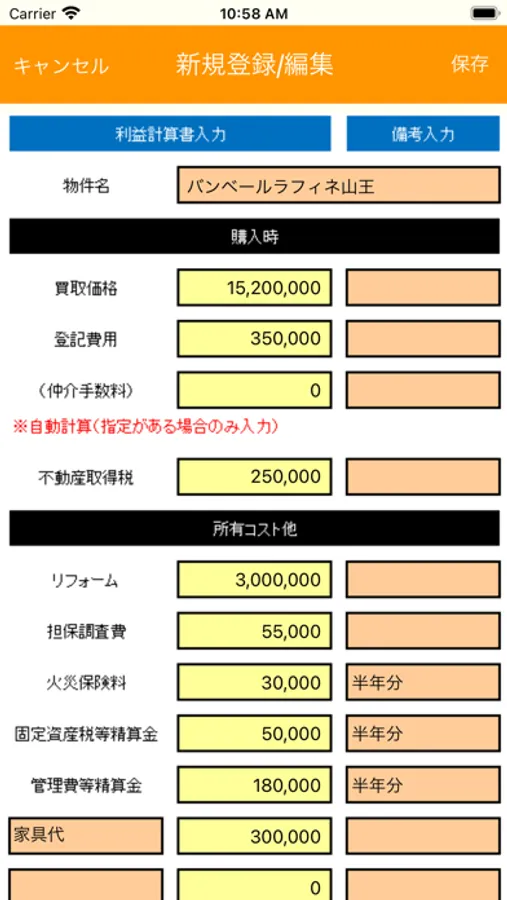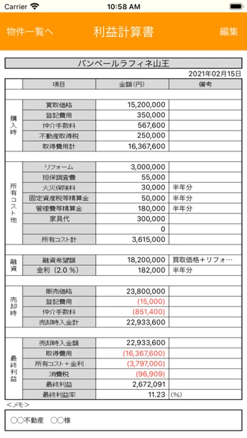 不動産物件の買取にかかるコストと再販にかかるコストの情報を入力すると、それら以外のコストや利益を自動計算します。登録された物件情報はアプリ内のデータベースに保存され、各物件一覧画面に表示されます。保存された物件情報の編集や削除も可能です。