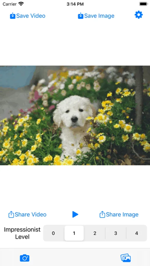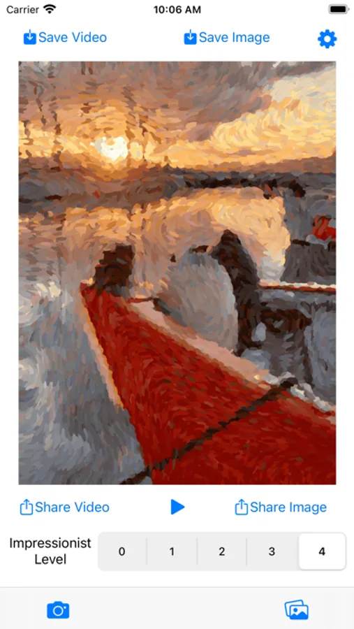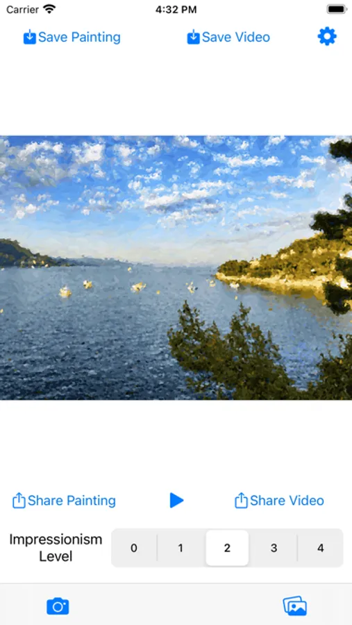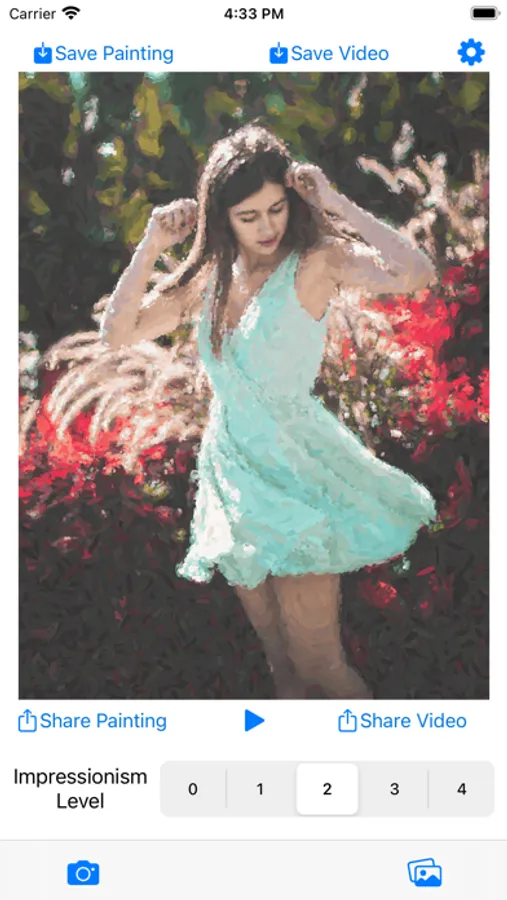 You can choose from 5 different painting styles - Impressionist level 0 through 4. Increasing the level will make the painting more impressionistic, while decreasing it will make it more realist (more closely matching the photo). The Repaint button in the bottom right allows you to create a slightly different version of the painting using the same photo and style - every painting generated is unique!