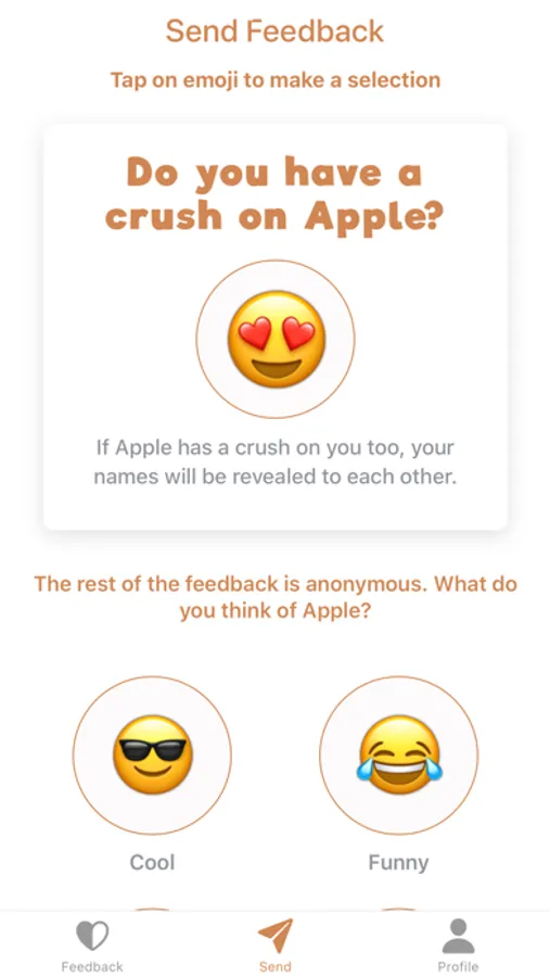 Tell your friends and others how you feel through emojis. Share your username and then others can tell you what they think of you. This is done anonymously. They can also send a crush emoji. If you send a crush to the same person, your names will be revealed to each other! "I have a crush on you" Say it in emoji!