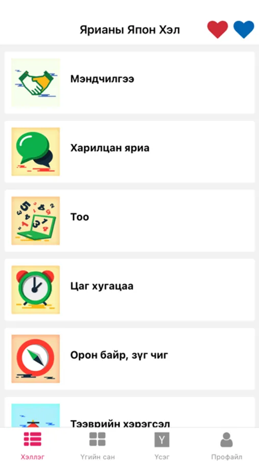 Япон хэлний өдөр дутмын хэрэглээний 1500+ хэллэг, 2000+ үгийн санг сурах боломжтой.