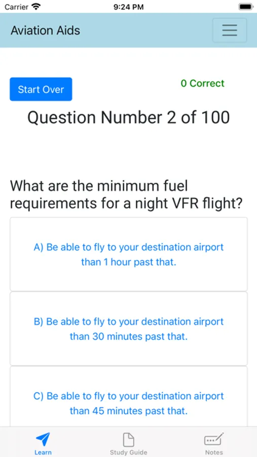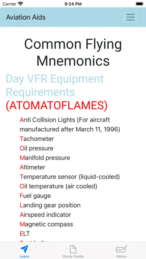 Aviation Aids is an all-in-one study guide to quickly and easily pass your next flight review! Save money and time with a CFI by avoiding a lengthy oral exam. Aviation aids has over 100 practice questions. Gain tips on how to perform during the flight portion of your review. Practice with common mnemonics to give you an edge in remembering the tough stuff.