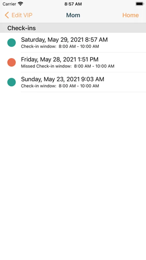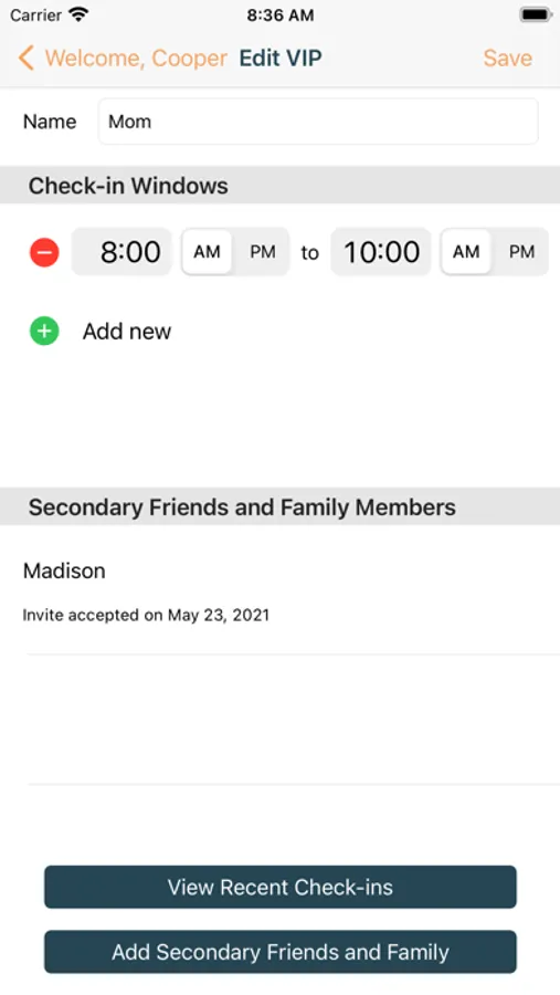 Install I'm Good-F&F and invite someone important to you (a VIP) to download our companion App called I'm Good-VIP. Once your VIP accepts the invitation, you can create one or more check-in windows each day for your VIP to check-in and let you know they are "good". Your VIP will be reminded to check-in halfway through their check-in window, and you will get notified if any VIP misses a check-in. The main screen of I'm Good-F&F provides a current status for each of your VIPs and enables you to view their recent check-in history.