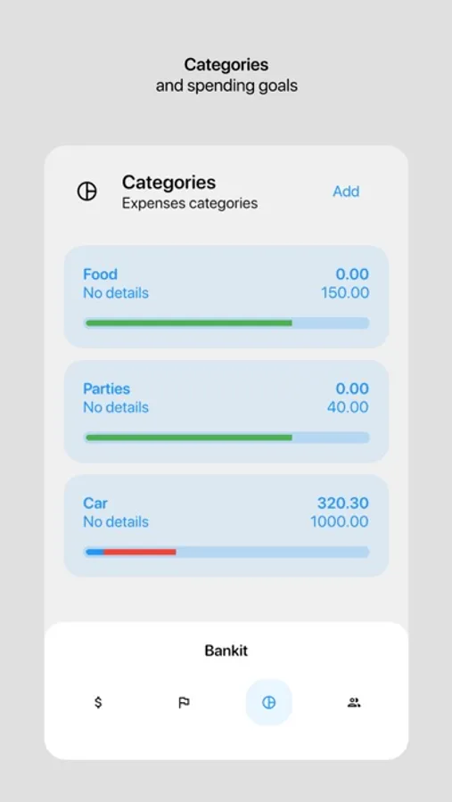 - Projects : if you have a project in mind, add it to Bankit. You can add how much you spent on this project, either alone or with friends and track the advancement or the participation of each person in this project. Like for the categories you can see if you are in advance or bellow the expected budget. You can add as many participants as you want in a project. All the participants can save money for the project.