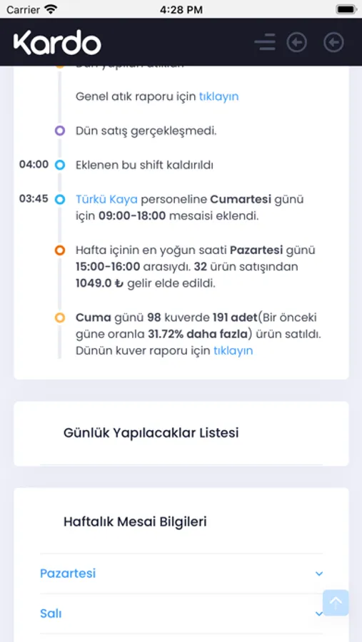 Kardo Pos Sisteminizi cebinizden daha kolay yönetebilir, personel takibi, personel için ücretsiz / indirimli ürün satışı yapabilir, işletmenizin tüm raporlarına tek tıkla ulaşabilirsiniz.