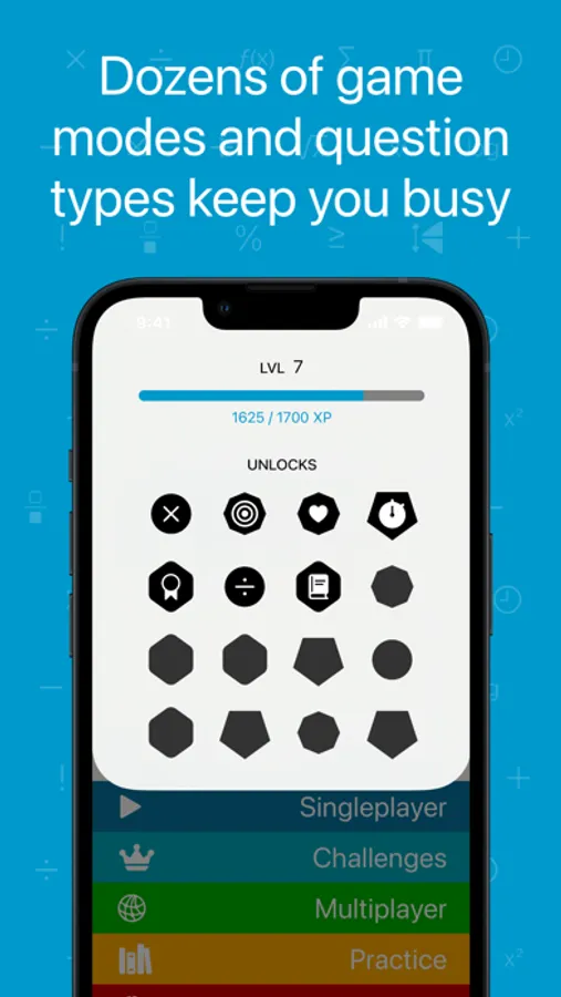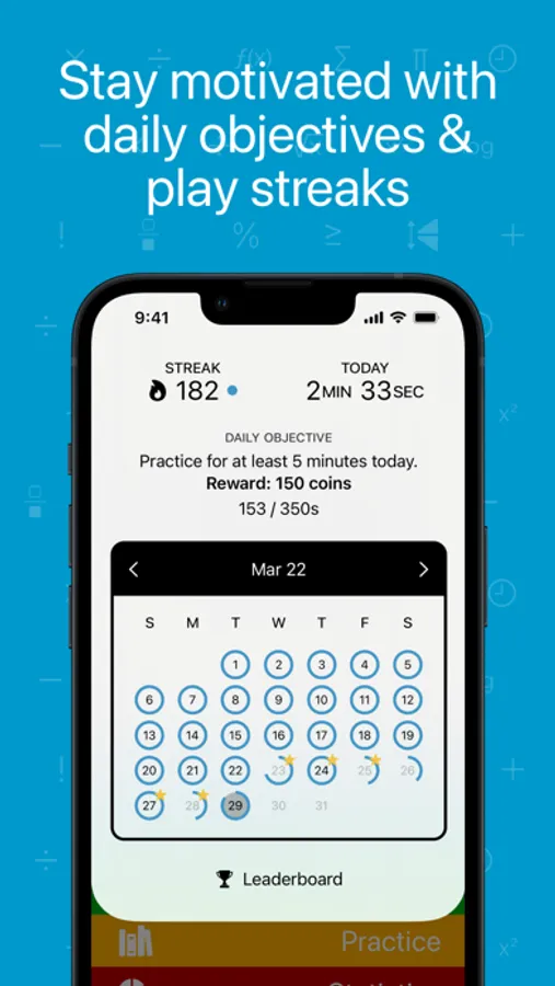 With Mathical, learning mental maths doesn't feel like work - for every level you finish you collect experience, which helps you level up to unlock new features. Additionally, Mathical motivates you with Achievements, Leaderboards, Daily Objectives, Play Streaks, and much more. All this guarantees that learning with Mathical never gets boring.