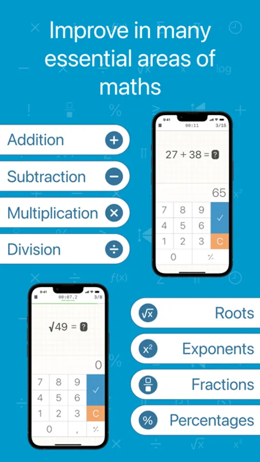 Mathical also features explanations, tips & tricks for common exercises like addition, multiplication, or roots. You will not only learn how these tasks work, but also how to solve them in your head quickly & efficiently.