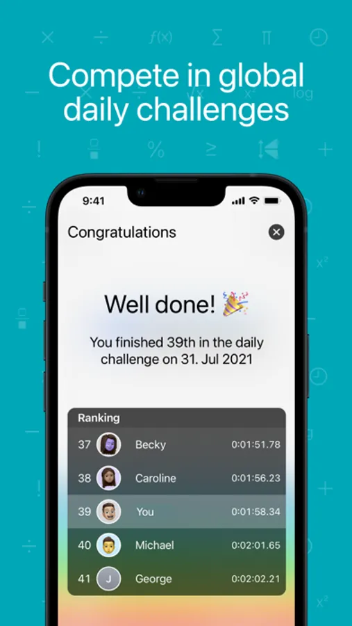 If you're convinced you can solve maths questions faster than others, you can prove it with Multiplayer in Mathical! Players can compete in the Daily Challenge, where everyone solves the same questions every day. If you decide to compete, you can see how you fared compared to other players on a global leaderboard.